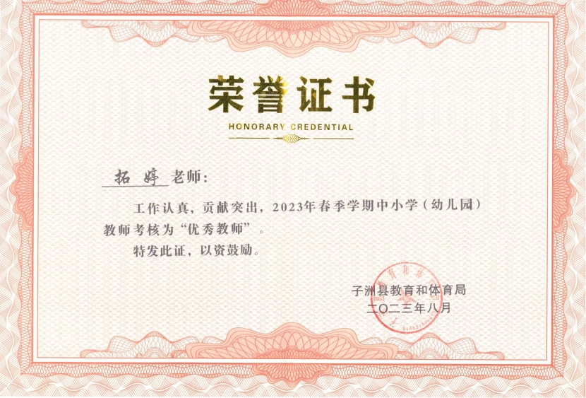 2023年08月01日 荣获 2023年春季学期中小学教师考核“优秀教师” 县级 未评等级