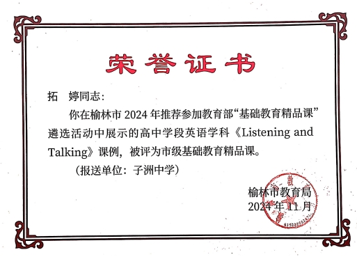 2024年11月01日 荣获 榆林市2024年市级基础教育精品课 地级教育行政部门 未评等级