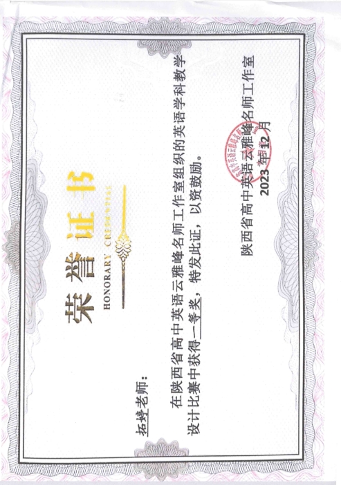 2023年12月01日 荣获 陕西省云雅峰名师工作室英语学科教学设计比赛一等奖 省级其他部门 一等