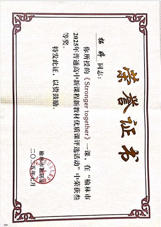 2025年07月01日 荣获 榆林市2025年普通高中新课程新教材优质课三等奖 地级教育行政部门 三等