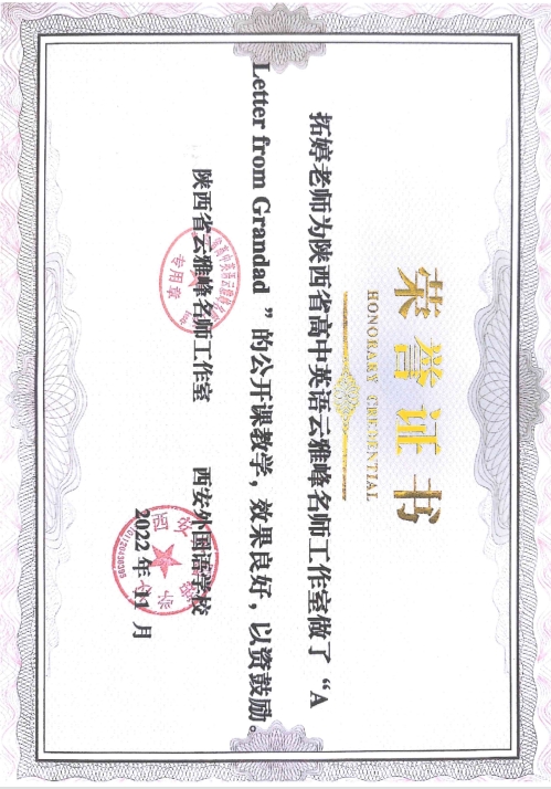 2022年11月01日 荣获 陕西省云雅峰名师工作室英语公开课教学 省级其他部门 其他