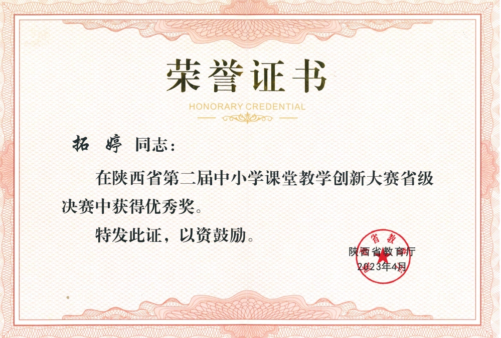 2023年04月01日 荣获 陕西省第二届中小学课堂创新大赛 省级教育行政部门 其他